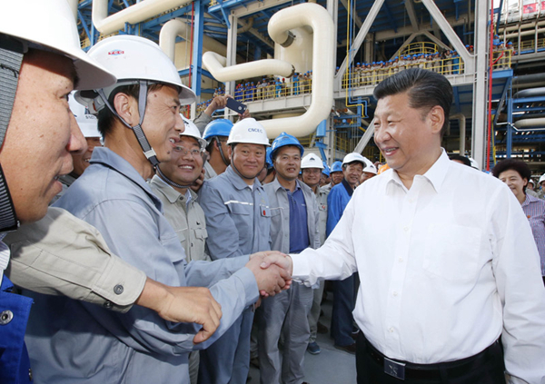 7月19日下午,習近平在寧東能源化工基地慰問煤制油項目技術研發團隊。 新華社記者鞠鵬攝