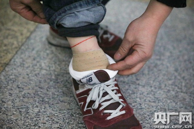 一整個(gè)晚上的巡查,原本因?yàn)橐淮巫ゲ缎袆?dòng)而腫脹的腳踝變得更加嚴(yán)重,這讓他走路的時(shí)候有點(diǎn)兒跛腳。卷起褲管,記者能聞到濃烈的膏藥味兒。“沒(méi)事兒,春運(yùn)人手緊張,能堅(jiān)持就堅(jiān)持。”對(duì)于王文升來(lái)說(shuō),負(fù)傷已經(jīng)是家常便飯。在他右手的大拇指上,記者還看到一塊少了皮肉的小坑。這是他在前天一次抓捕行動(dòng)中,被嫌疑人用鑰匙捅傷的。