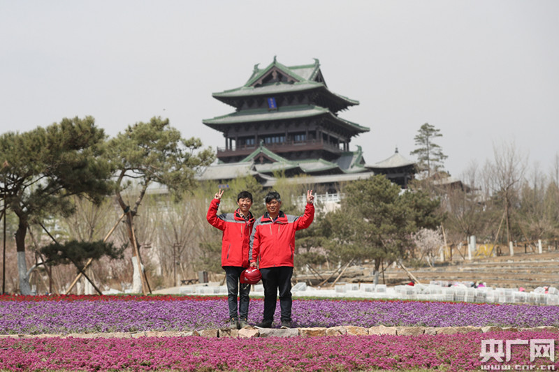 董守真(右)和董道宏正在打理花卉。圖片攝于4月7日。(央廣網記者 韓靖 攝)