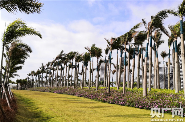 原先江畔2000多畝淤泥沉積、發黑發臭的蝦塘早已不見蹤影,取而代之的是煥然一新的濱海勝景——潮漲江水滿,陽光鋪在江面上,波光粼粼;青草沿岸生長,整齊青蔥;邊上的棕櫚樹一字排開,每一棵都是直挺挺的,修長的樹葉在海風中搖曳,浮動的影子打在樹底下五彩繽紛的花團上,時隱時現。