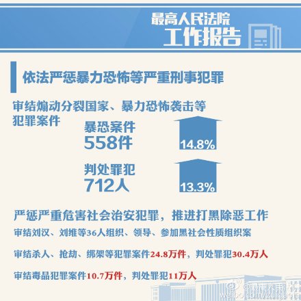 最高人民法院院長周強(qiáng)表示,會(huì)同有關(guān)部門出臺(tái)辦理暴力恐怖和宗教極端刑事案件的意見,依法嚴(yán)懲天安門“10·28”、昆明“3·01”等暴力恐怖犯罪;嚴(yán)懲嚴(yán)重危害社會(huì)治安犯罪,推進(jìn)打黑除惡工作。