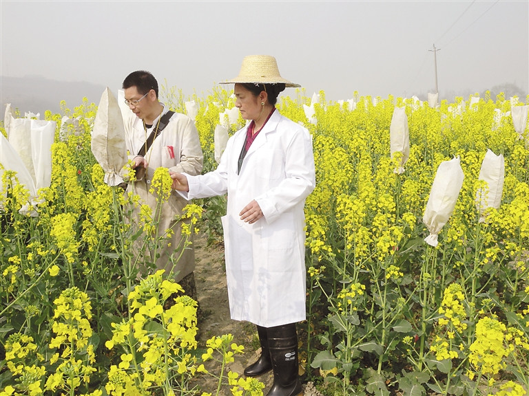 科技工作者尼瑪卓瑪在試驗田檢查油菜生長情況。