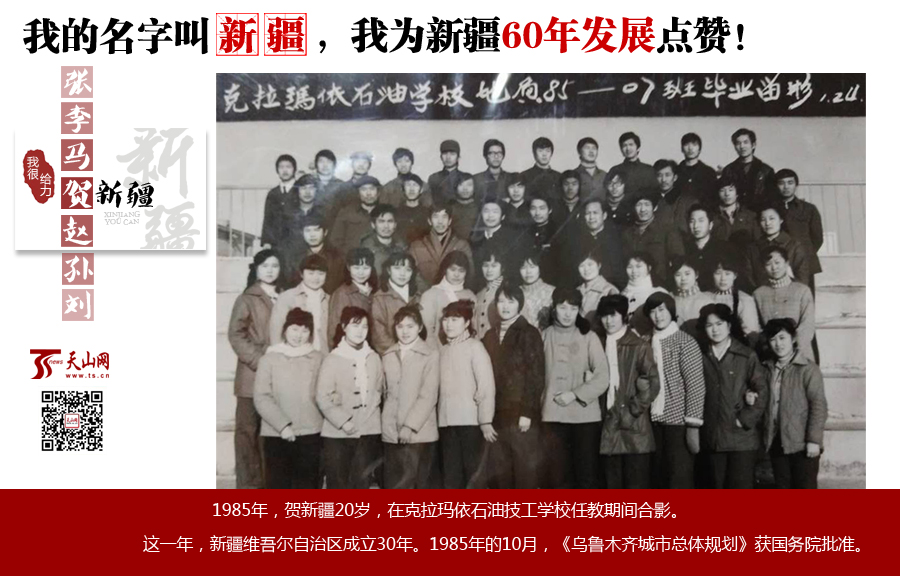 1984年7月,我報名來新疆支援邊疆,來了之后,就下定決心改名叫新疆。因為新疆離家很遠,我掛念家中母親,所以就自作主張跟了母親的姓,叫賀新疆,家里的弟弟還跟父親姓楊,當時說出這個想法時,父親也支持了我。而賀新疆這個名字,也有祝賀一批批有志青年到新疆、扎根邊疆、建設新疆的寓意。