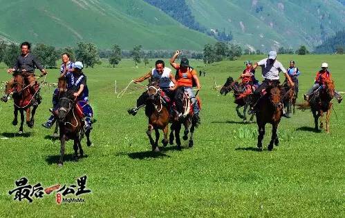 游客在新疆那拉提旅游風景區內與當地哈薩克族青年一起賽馬。