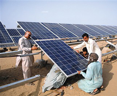 巴基斯坦工人在中興能源900兆瓦光伏地面電站安裝太陽能電池板。艾哈邁德·卡邁勒攝(新華社發(fā))