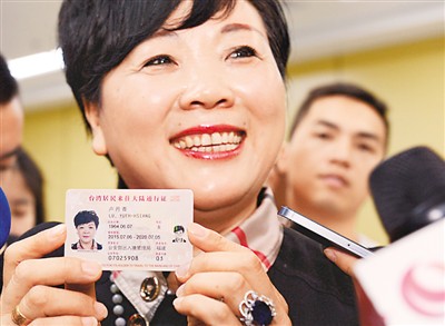 2015年7月6日,臺胞盧月香在展示福建省公安機關(guān)出入境管理部門簽發(fā)的首張電子臺胞證。 新華社記者 張國俊攝
