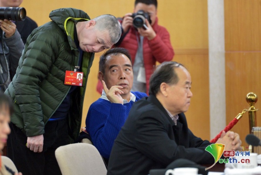 中國青年網(wǎng)北京3月5日電 3月5日,在全國政協(xié)十二屆四次會(huì)議小組會(huì)議上,各組的委員們正忙碌著審議常委會(huì)工作報(bào)告和提案工作情況報(bào)告。委員們時(shí)而“交頭接耳”,時(shí)而“竊竊私語”。圖為 馮小剛委員(左)與陳凱歌委員(中)交談。
