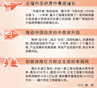這是只爭朝夕的5年。“天眼”探空、“蛟龍”探海、神舟飛天、高鐵奔馳、北斗組網、大飛機首飛……一批分布在高端裝備、戰略性新興產業、信息化等方面的重大工程驚艷全球。從量的積累,到質的飛躍;從點的突破,到系統能力的提升,創新畫卷壯闊鋪展,重大工程成為現代化建設的可靠支撐。