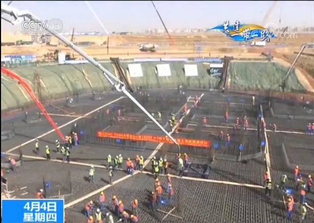 央視記者 陸雋弘:在我的身后,就是在建中的非洲第一高樓——埃及新首都中央商務區“標志塔”的施工現場。那么就在不久之前,這里是剛剛完成了“標志塔”主樓基礎底板的澆筑。這個直徑約70米,厚度達到5米的多邊形鋼筋混凝土底板,是埃及歷史上最大的建筑底板。由于運用了多項中國在此方面的領先技術,因此這樣體量的底板澆筑只用了38小時便全部完工,而通常情況下,同類型工程所需的時間一般都在70小時以上。38小時也一舉創出了中東和非洲建筑史上澆筑超大型基礎底板的最快紀錄。