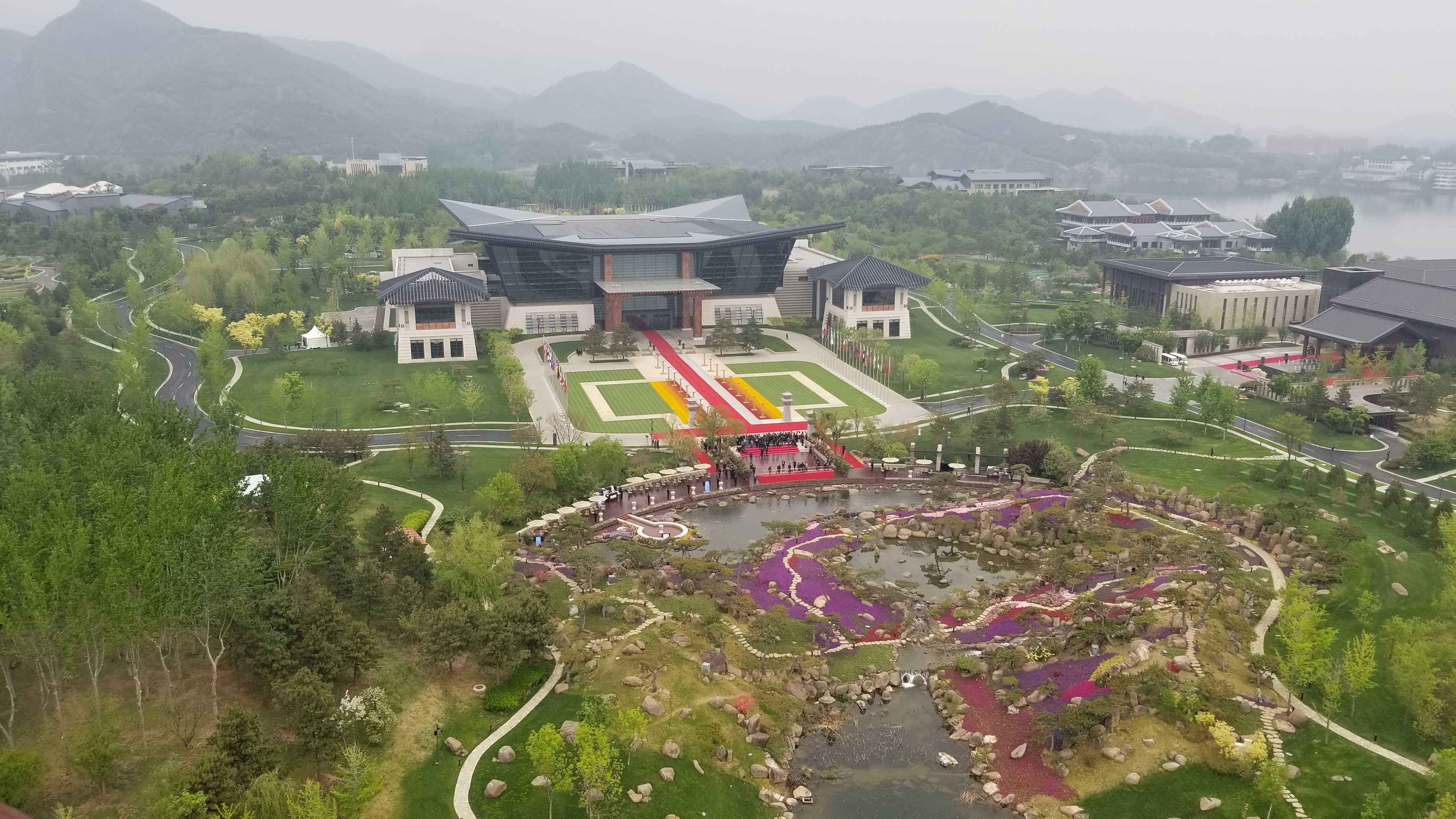 △雁棲湖國際會議中心三面環山,造型猶如一把環抱水面的椅子。它以古代絲綢之路興盛時期的中國漢唐建筑風格為設計靈感,采納了“中軸線”和四合院的建筑模式。建筑與園林整體布局寓意是“鴻雁展翼、漢唐飛揚”。(央視記者洪磊拍攝)