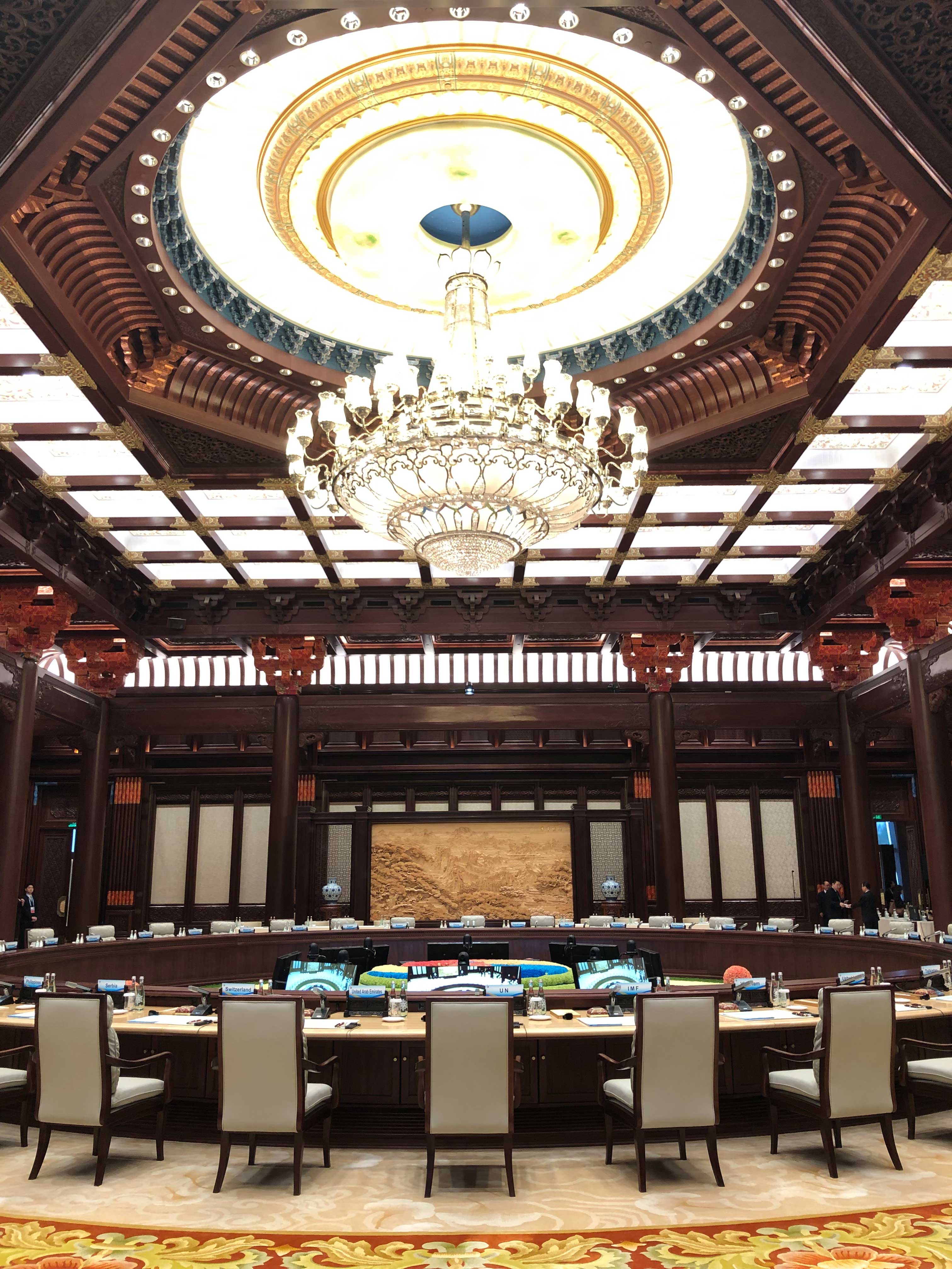 △又見集賢廳的大圓桌。圓桌會議是指一種平等、對話的協商會議形式。為避免席位主次之別、表示參加各方地位平等,與會各方圍圓桌而坐。(央視記者馬亞陽拍攝)