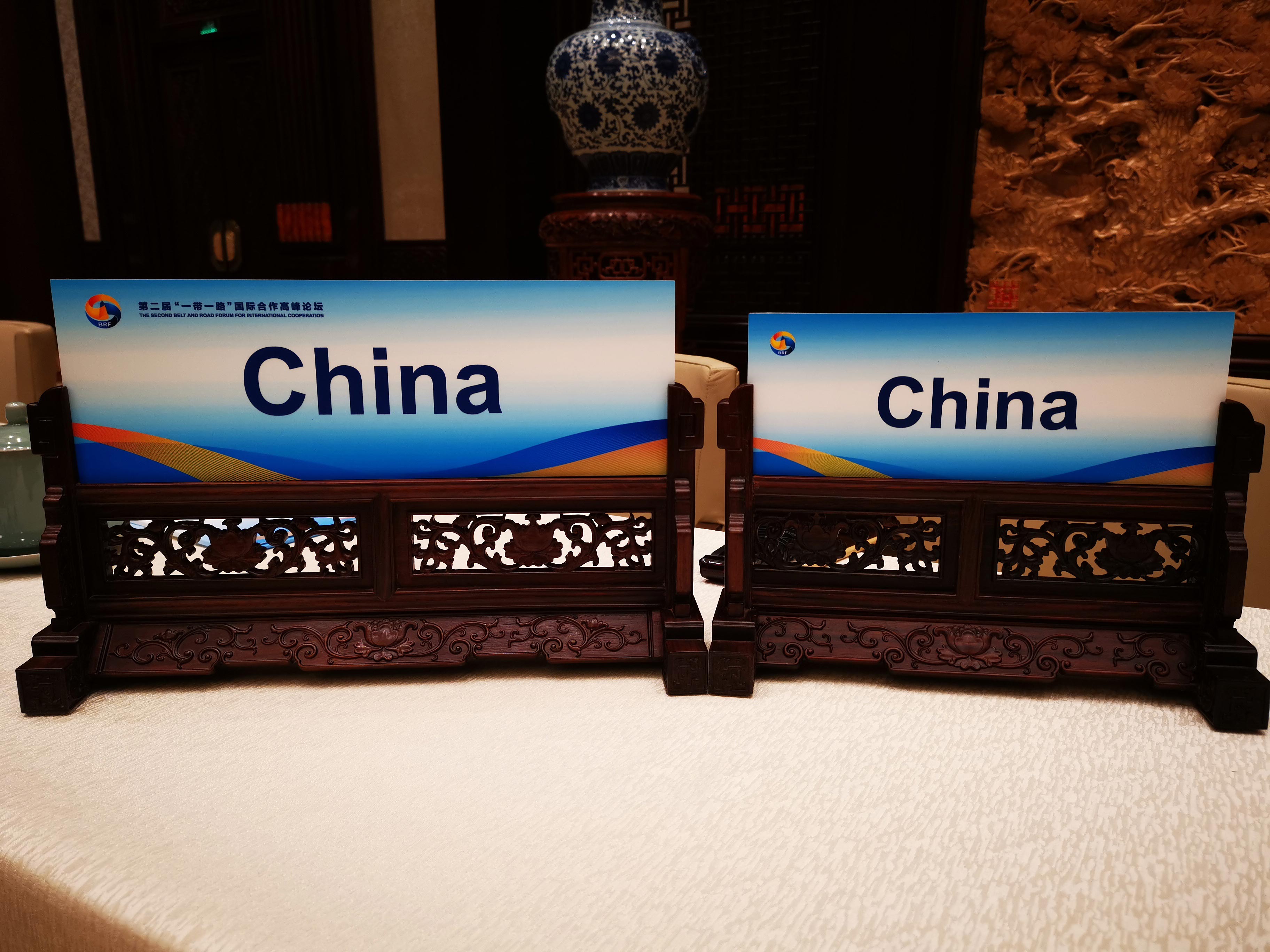△圓桌峰會桌簽的設計靈感來源于中式雕花屏風設計。為了讓畫面構圖達到最佳效果,習主席桌上的桌簽是精心挑選過尺寸的。這是在早前的論壇演練中《時政新聞眼》拍到的。(央視記者張曉鵬拍攝)