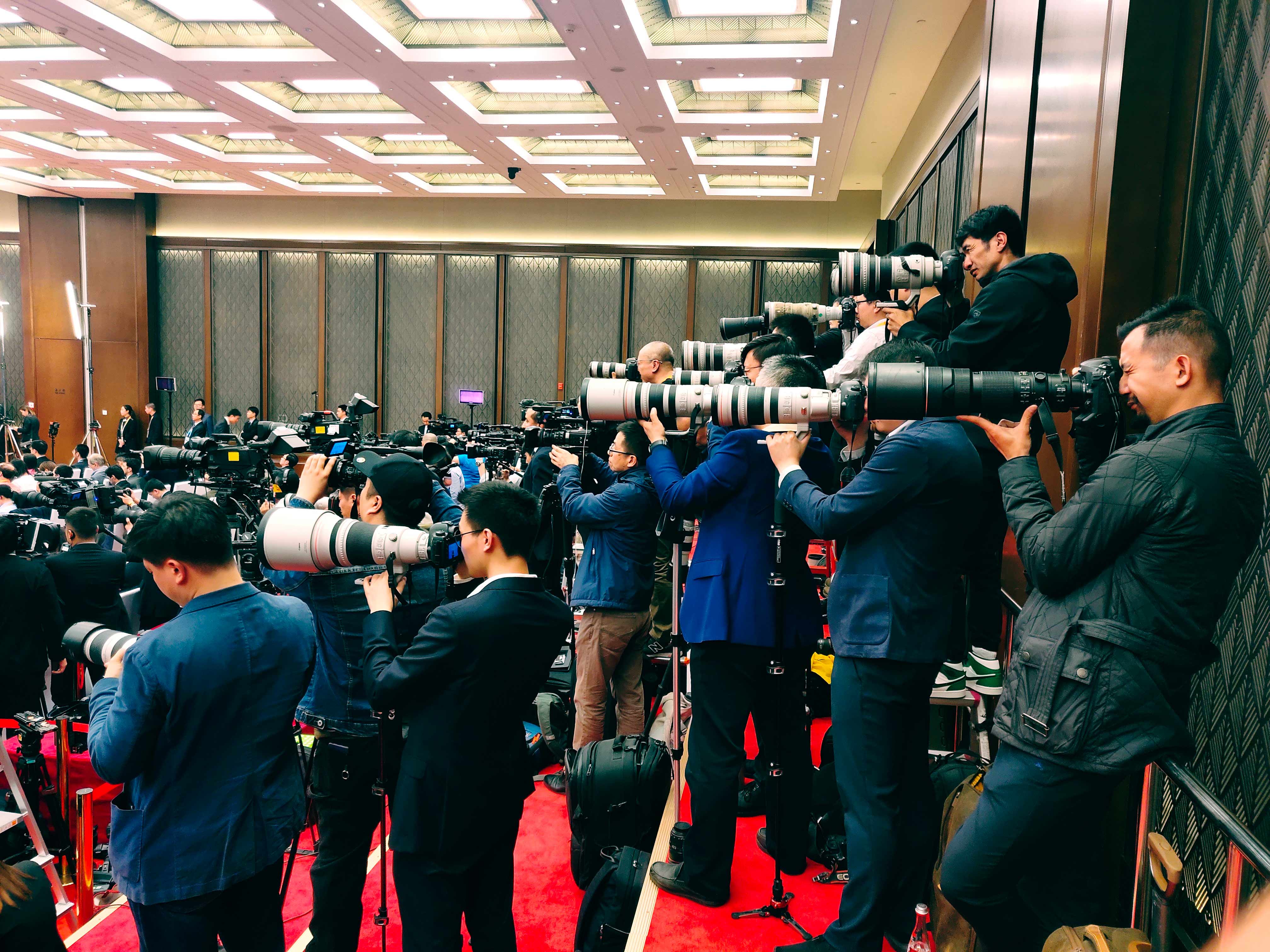 △記者會現場的各國攝影記者。(央視記者李曉周拍攝)