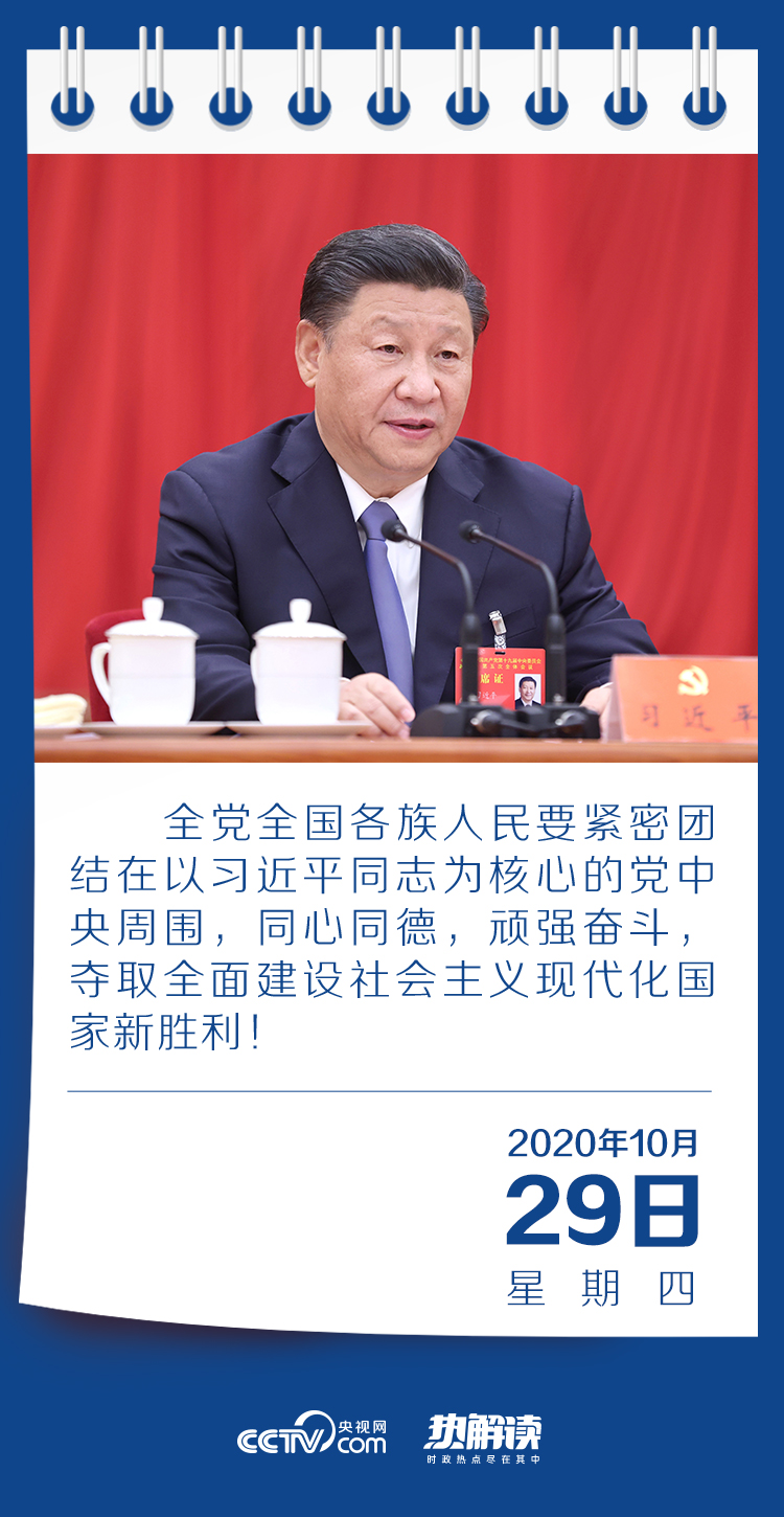 10月29日,中國共產黨第十九屆中央委員會第五次全體會議在金色的秋天里勝利閉幕。全會由中央政治局主持。中央委員會總書記習近平作了重要講話。