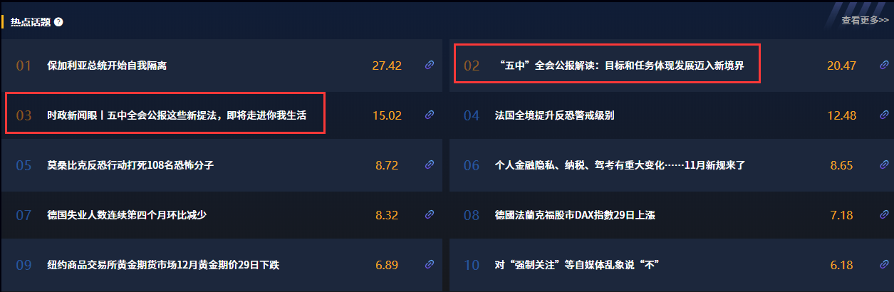 運用央視網“智聞”系統對30日全網新聞熱點進行抓取,在熱點話題一欄,全會公報相關報道穩居話題榜前列,相關報道也引起廣大網友的熱議。