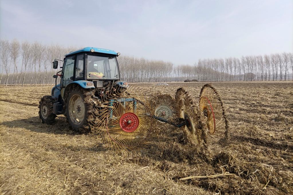 2022年4月4日,吉林德強種植業(yè)家庭農場農民在田間進行秸稈歸行作業(yè)。新華社發(fā)