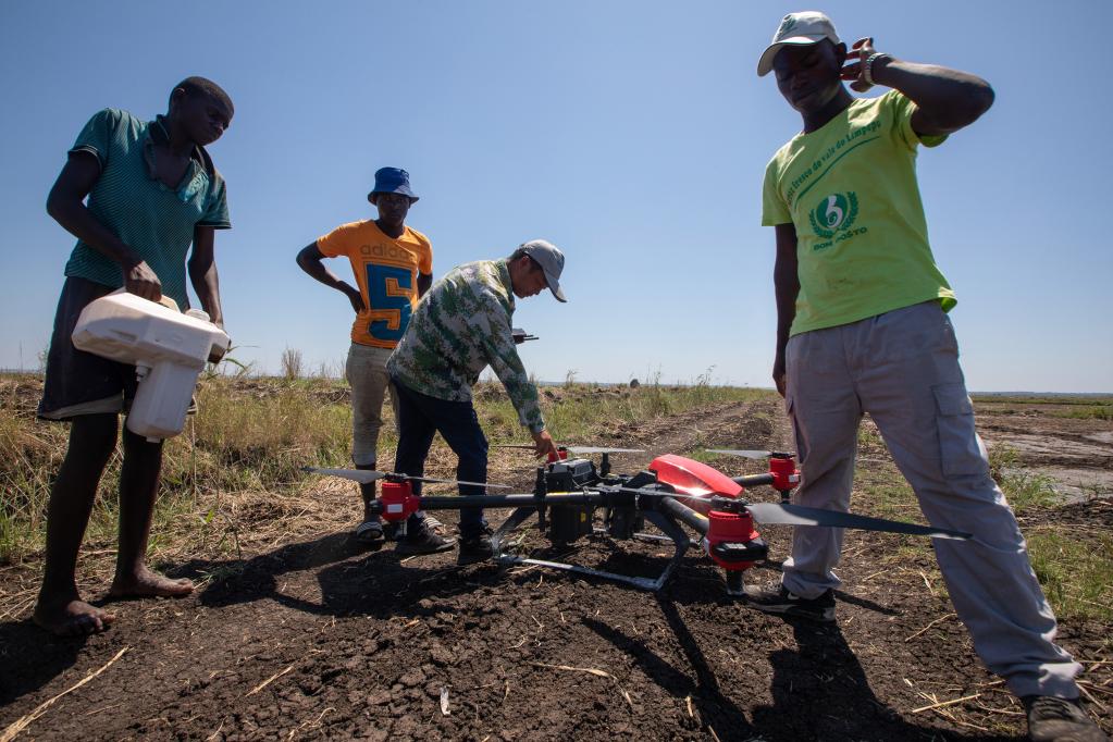 2019年11月28日,在莫桑比克的萬寶莫桑農業(yè)園,中國農業(yè)專家(右二)指導當?shù)毓と耸褂脽o人機噴灑除草劑。新華社記者 張宇 攝