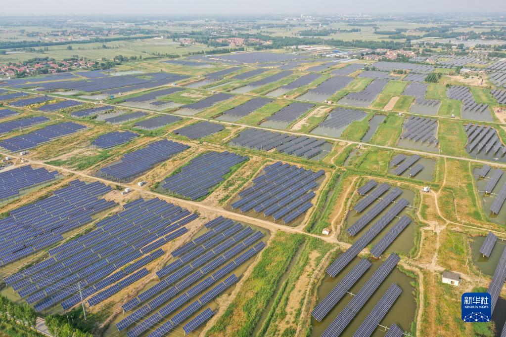 山東高青縣湖東村周邊建設的千余畝漁光互補養殖場(2022年5月24日攝,無人機照片)。新華社記者 朱崢 攝