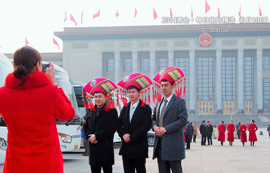 3月10日,工作人員借用壯族頭飾拍照留念。(圖片來源:CFP)