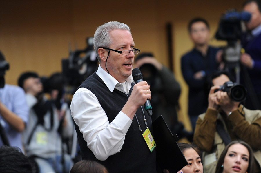 2014年3月6日上午9時,十二屆全國人大二次會議新聞中心在梅地亞中心多功能廳舉行記者會,邀請財政部部長樓繼偉、副部長張少春就“財稅體制改革和財政工作”的相關問題回答中外記者的提問。圖為德國新聞社記者提問。新華網(wǎng)/中國政府網(wǎng) 翟子赫攝