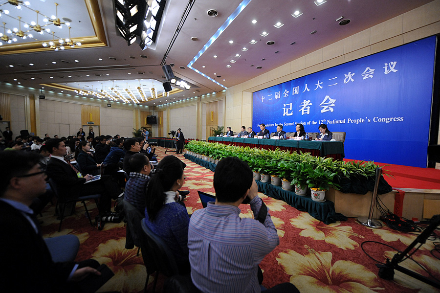 3月9日15時,十二屆全國人大二次會議新聞中心在梅地亞中心多功能廳舉行記者會,全國人大五位負責人將就“人大立法和監督工作”相關問題回答中外記者提問。圖為記者會現場。陳競超 攝