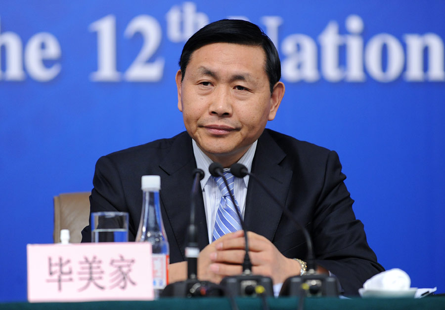 2014年3月6日上午10時30分,十二屆全國人大二次會議新聞中心在梅地亞中心多功能廳舉行記者會,邀請農業部部長韓長賦,總經濟師、新聞發言人畢美家就“扎實深化農村改革,加快發展現代農業”的相關問題回答中外記者的提問。圖為農業部總經濟師、新聞發言人畢美家 。新華網/中國政府網 翟子赫攝