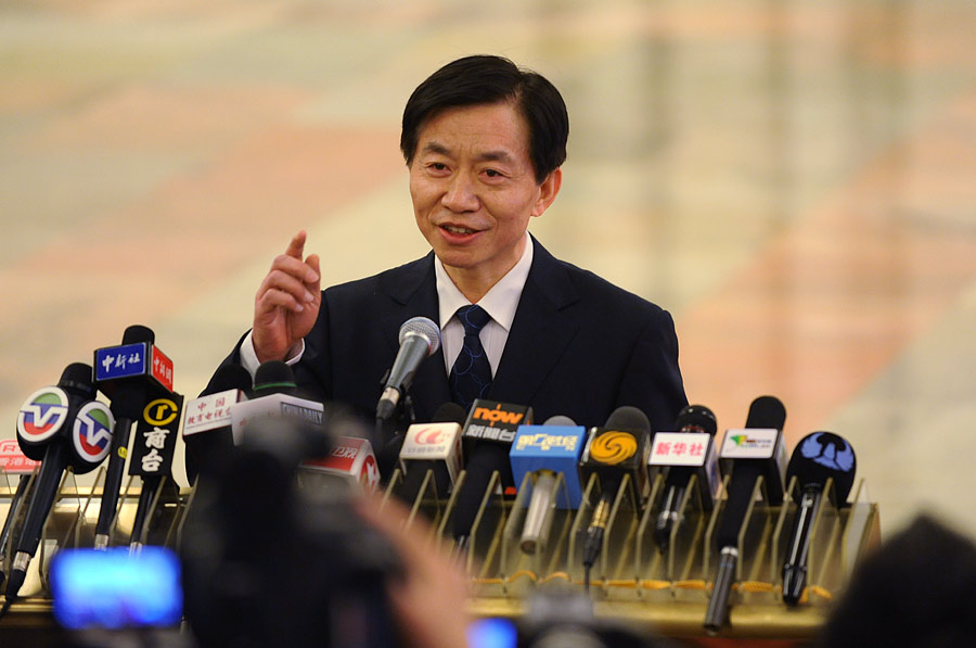 2014年3月9日(星期日)上午9時,第十二屆全國人民代表大會第二次會議在人民大會堂舉行第二次全體會議,聽取全國人大常委會委員長張德江作全國人大常委會工作報告。中央紀(jì)委副書記、監(jiān)察部部長、國家預(yù)防腐敗局局長黃樹賢回答記者提問。新華網(wǎng)/中國政府網(wǎng) 翟子赫 攝