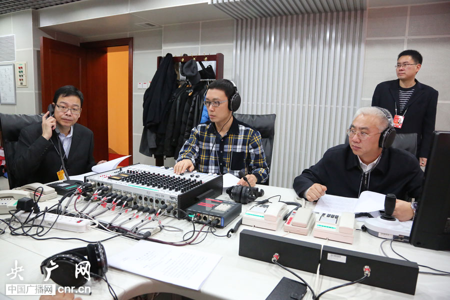 中央人民廣播電臺總工程師錢岳林、副總編輯劉曉龍現場指揮直播工作(央廣網記者涂傲攝)