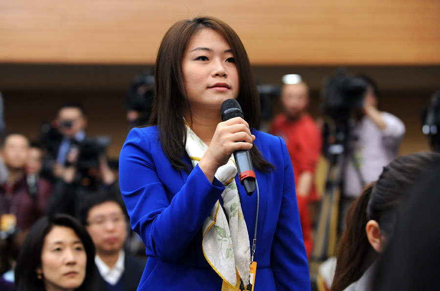 2014年3月8日上午10時,十二屆全國人大二次會議在梅地亞多功能廳舉行記者會,外交部部長王毅就“中國的外交政策和對外關系”的相關問題回答中外記者的提問。圖為人民日報和人民網記者提問。新華網/中國政府網 翟子赫 攝