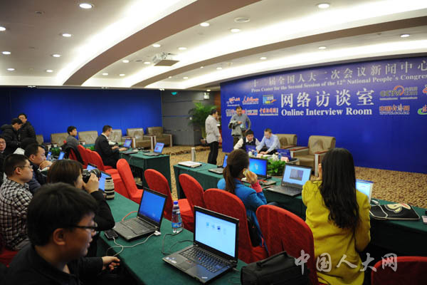 3月5日晚,十二屆全國人大二次會議新聞中心組織12家網站,聯合舉辦主題為“凝聚海內外中華兒女力量同圓共享中國夢”的網絡訪談,邀請國務院僑辦裘援平主任,與網民進行在線交流。圖為在線交流即將開始。中國人大網 李杰 攝