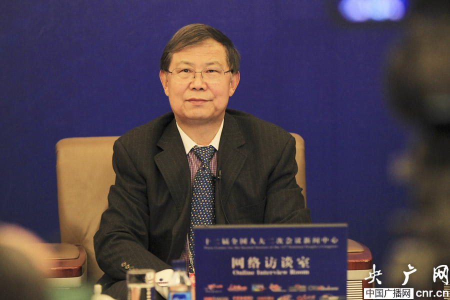 十二屆全國人大二次會議新聞中心副主任祝壽臣主持此次訪談(央廣網記者 張曈 攝)