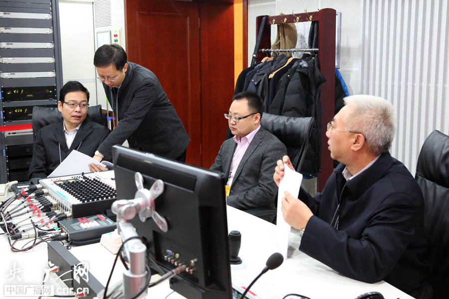 中央人民廣播電臺總工程師錢岳林、副總編輯劉曉龍現場指揮中央臺全國政協十二屆二次會議閉幕會直播工作