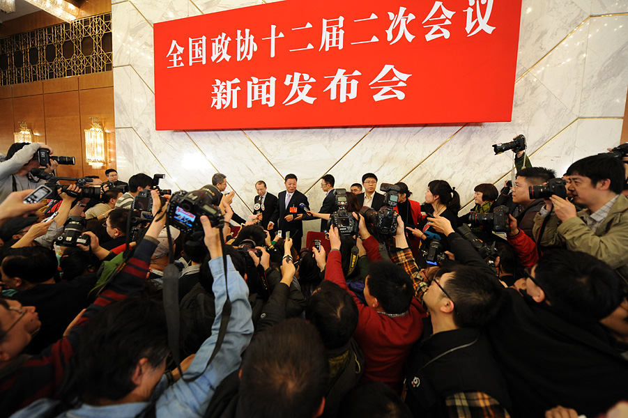 3月2日,全國政協十二屆二次會議新聞發布會在人民大會堂一層新聞發布廳舉,圖為發布會結束后,記者圍堵采訪呂新華。新華網/中國政府網 陳競超 攝