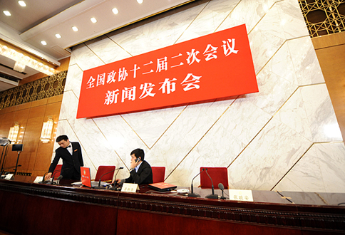 3月2日,全國政協(xié)十二屆二次會(huì)議新聞發(fā)布會(huì)在人民大會(huì)堂一層新聞發(fā)布廳舉行。圖為工作人員正在布置場(chǎng)地。新華網(wǎng)/中國政府網(wǎng) 陳競(jìng)超 攝