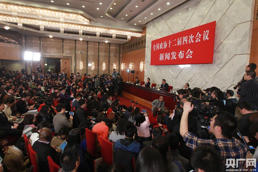 央廣網北京3月2日消息(記者韓靖)全國政協十二屆四次會議將于3月3日在北京舉行,雖然2016年全國兩會還沒開幕,但是記者們已經開始了“新聞戰”。圖為全國政協十二屆四次會議新聞發布會現場。(央廣網記者 韓靖 攝)