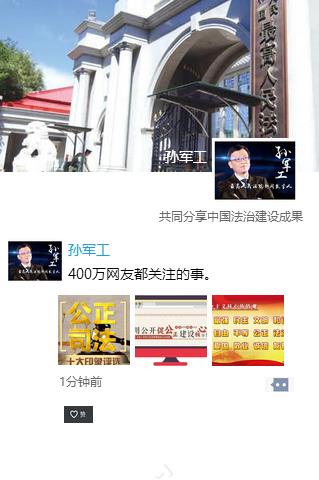 談到發(fā)三條關(guān)于最高法的朋友圈信息,打算發(fā)哪些內(nèi)容?孫軍工表示,第三條朋友圈的內(nèi)容確實(shí)很難選擇,因?yàn)檫^(guò)去一年法院要分享的內(nèi)容實(shí)在太多,他想還是根據(jù)廣大網(wǎng)友的意見,發(fā)送一條關(guān)于弘揚(yáng)社會(huì)主義核心價(jià)值觀的內(nèi)容。