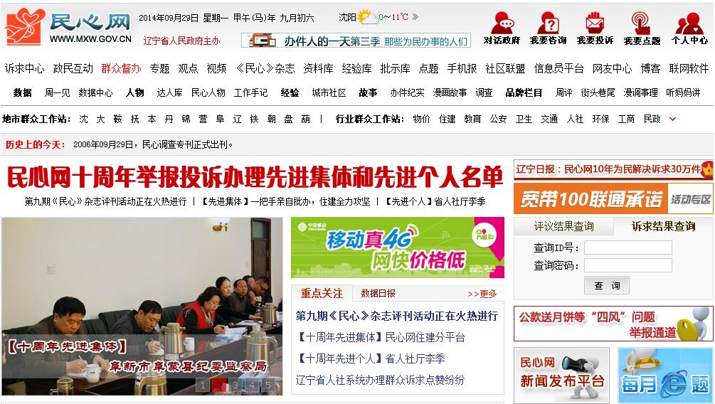 “民心網”開通于2004年5月21日。最初是遼寧省紀委監察廳和省政府糾風辦創建的一個糾風網絡工作平臺。開辦七年來,民心網作為一個自收自支的事業單位不斷發展壯大,目前有員工100多人,聯網的黨政機關有2000余個,辦理的群眾訴求量從2004年的1452件增加到2010年的75010件,群眾滿意率從2004年的82%提高到2010年的98.7%。民心網已經形成了一個省市縣三級聯動覆蓋十個熱點行業和部門的公開受理和辦理群眾訴求的網絡體系,在辦理群眾訴求、反映民情民意等方面發揮著日益重要的作用。