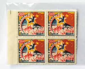 “這是唯一一套解放區紀念新中國成立的郵票,也是中國郵政部門在新中國成立當年唯一發行的紀念中華人民共和國成立的郵票。”有趣的是,這枚郵票當年的面值是東北幣35元,“因為在解放戰爭時期,東北解放區東北銀行發行的地方流通券‘東北幣’流通于東北地區,當時東北解放區發行的郵票,以及郵電部于1949年10月8日至1950年12月1日先后發行的東北貼用郵票,均以東北幣為面值。”郭勇稱。