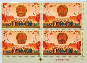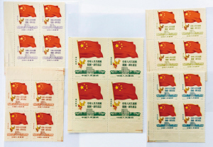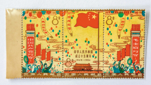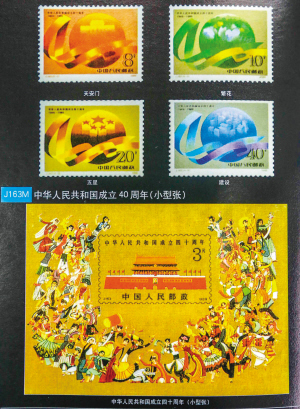 1949年10月1日,是中華人民共和國的第一個國慶日。開國大典在北京天安門廣場隆重舉行。毛澤東主席在天安門城樓上莊嚴地宣告中華人民共和國成立。中國的歷史從此開辟了一個新的時代。專攻新中國郵票的四川省收藏家協會秘書長郭勇介紹,為紀念這一歷史時刻,當年11月15日發行了新中國成立紀念郵票,這套郵票僅一枚,郵票由紅黃藍三色套印,圖案中間是巨大的五角星和毛澤東像,左邊是半圓形機輪,右邊是國旗,國旗下是舉手歡迎的人群。