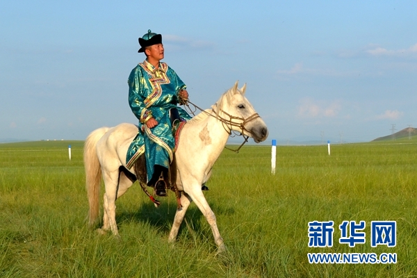 騎馬走在草原上(2012年7月15日攝)。在一場草原大火中,為保護牧民生命財產安全,生死懸于一線之際,他果斷把生的機會留給他人,自己41歲的生命永遠定格。他,就是內蒙古自治區西烏珠穆沁旗農牧業局局長吉日嘎拉。新華社發