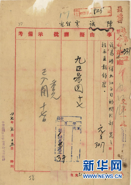 1938年7月14日,第九戰(zhàn)區(qū)司令長官陳誠報告防守九江之部隊部署情形致蔣介石代電。 新華社發(fā)(第二歷史檔案館提供)