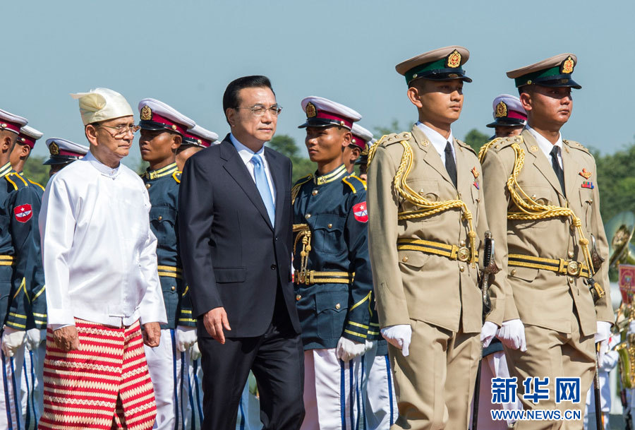 11月14日,國務(wù)院總理李克強(qiáng)在內(nèi)比都同緬甸總統(tǒng)吳登盛舉行會談。這是會談前,吳登盛在緬甸總統(tǒng)府前廣場為李克強(qiáng)舉行隆重的歡迎儀式。新華社記者王曄攝