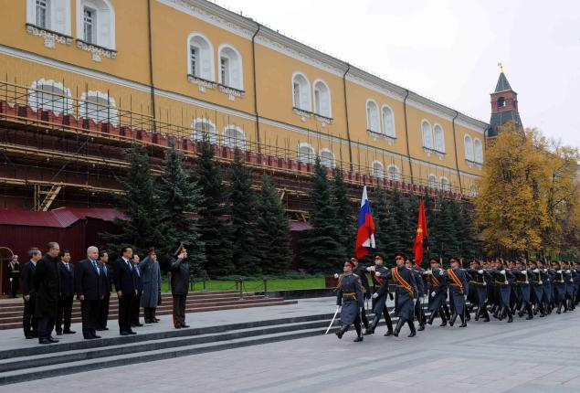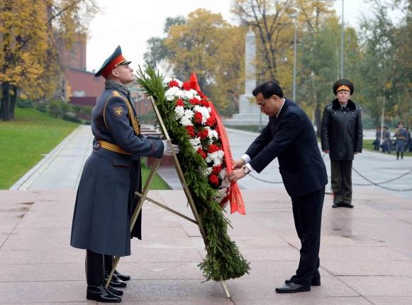新華網北京10月14日電 據新華社“新華國際”客戶端報道,一場秋雨洗滌了莫斯科的寒夜。13日一早,克強總理來到克里姆林宮外的無名烈士墓,憑吊衛國戰爭中的犧牲者。