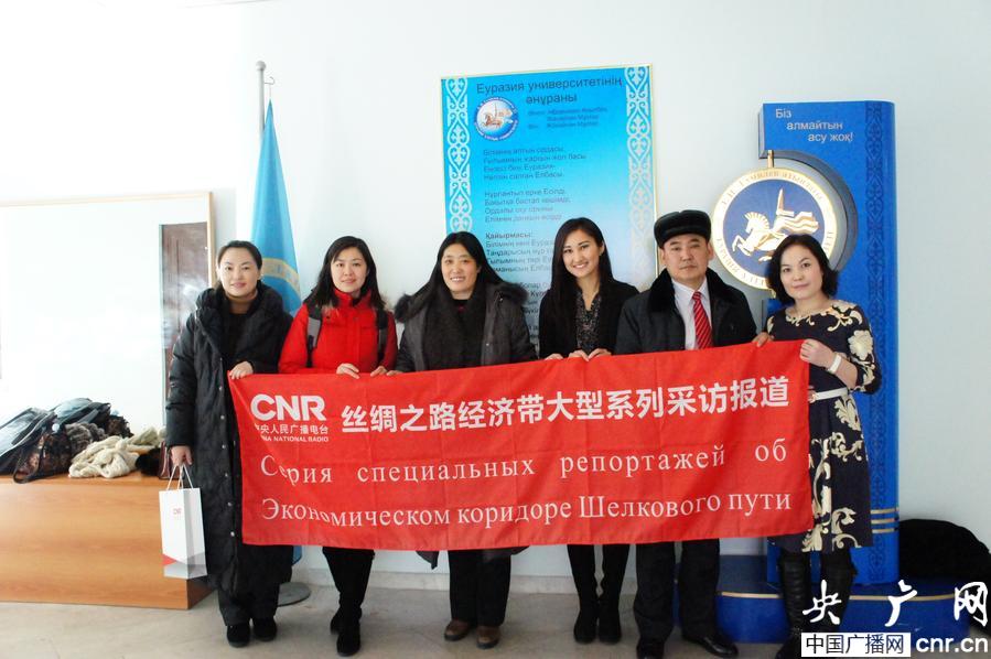 那扎(右二)和努爾孜亞(右一)等在哈薩克斯坦歐亞大學采訪后合影