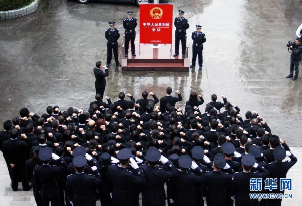 11月24日,重慶市云陽縣人民法院的干警面向《憲法》宣誓。當日,重慶市云陽縣人民法院舉辦紀念設立“國家憲法日”主題實踐活動,全院160多名干警面向《憲法》莊嚴宣誓,并在“弘揚《憲法》民主精神,履行使命公正司法”條幅上簽名。十二屆全國人大常委會第十一次會議于11月1日審議通過了關于設立國家憲法日的決定,明確將12月4日設立為國家憲法日,國家通過多種形式開展憲法宣傳教育活動。新華社發(覃輝 攝)