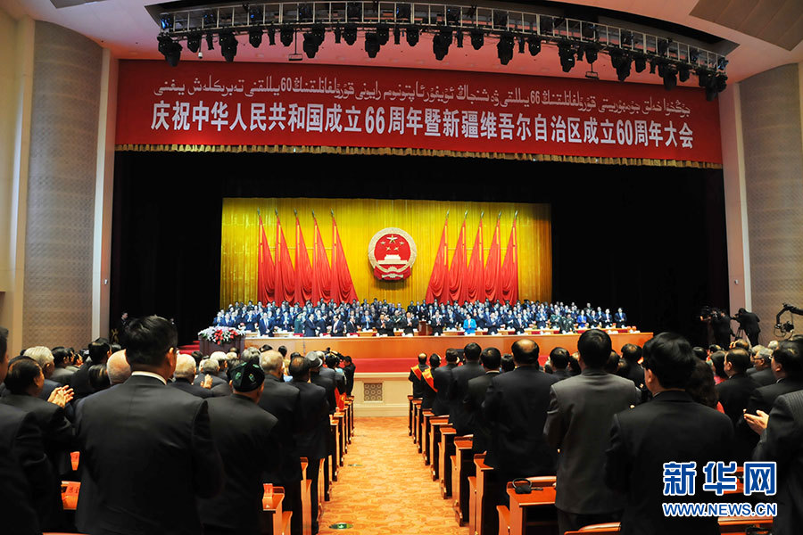 10月1日,慶祝中華人民共和國成立66周年暨新疆維吾爾自治區成立60周年大會在新疆人民會堂舉行。圖為大會開始現場全體觀眾起立鼓掌。新華網記者 王新彪 攝