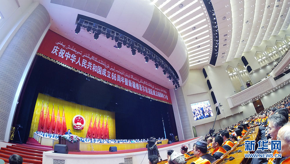 10月1日,慶祝中華人民共和國成立66周年暨新疆維吾爾自治區成立60周年大會在新疆人民會堂舉行。圖為大會現場。新華網記者 郭小天 攝
