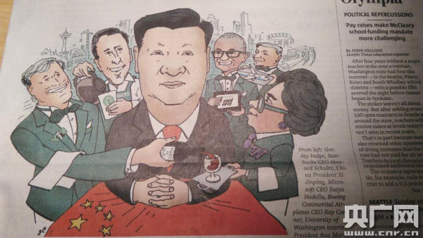當(dāng)?shù)孛襟w比如“西雅圖時(shí)報(bào)”,這是華盛頓州最大的日報(bào),并且是在西北最大的周日發(fā)行的報(bào)紙。也是10個(gè)普利策獎得主,在今天,也就是當(dāng)?shù)貢r(shí)間周日早上,報(bào)紙頭版頭條配有手繪圖的對習(xí)主席即將訪問的報(bào)道,大標(biāo)題寫著“友好的華盛頓已經(jīng)鋪好了歡迎的地毯”。手繪圖上,習(xí)主席帶著紅色領(lǐng)帶坐在中間,身后從左至右先是華盛頓州州長杰伊·英斯利給他倒了一瓶名為產(chǎn)自華盛頓的紅酒,這位金色頭發(fā)的州長還給自己起了個(gè)很潮的中文名“周杰倫”、在他旁邊是準(zhǔn)備了一杯星巴克的舒爾茨、而后是舉著有微軟標(biāo)志的平板電腦的微軟CEO納德拉、捧著787模型的波音民用飛機(jī)集團(tuán)總裁雷·康納、以及端著紅酒杯的華盛頓大學(xué)校長安娜·瑪麗·科斯。可以說,這張圖也非常形象地說明了當(dāng)?shù)馗鹘鐚α?xí)主席訪問的期盼。