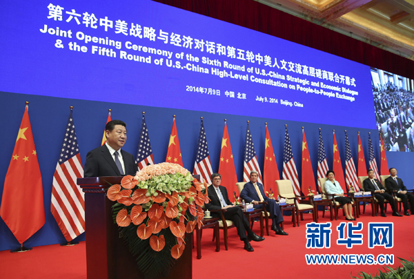 2014年7月9日,第六輪中美戰(zhàn)略與經(jīng)濟(jì)對(duì)話(huà)和第五輪中美人文交流高層磋商聯(lián)合開(kāi)幕式在北京舉行。國(guó)家主席習(xí)近平出席開(kāi)幕式并致辭。新華社記者龐興雷 攝