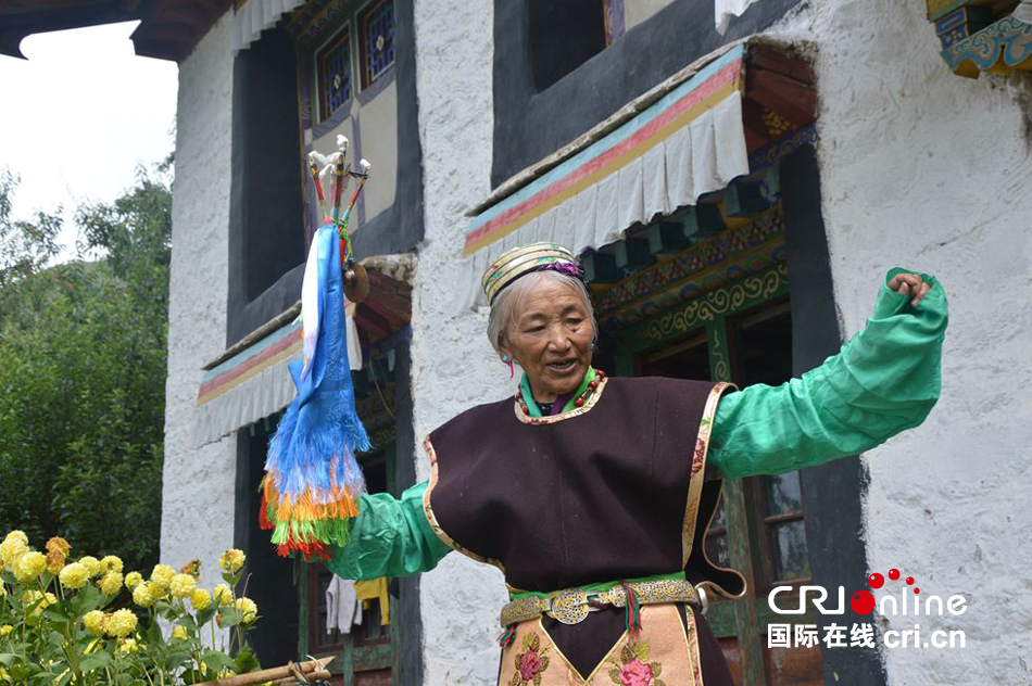 75歲的桑杰康卓老人身著工布傳統服裝在表演工布箭歌 攝影 王聿喆